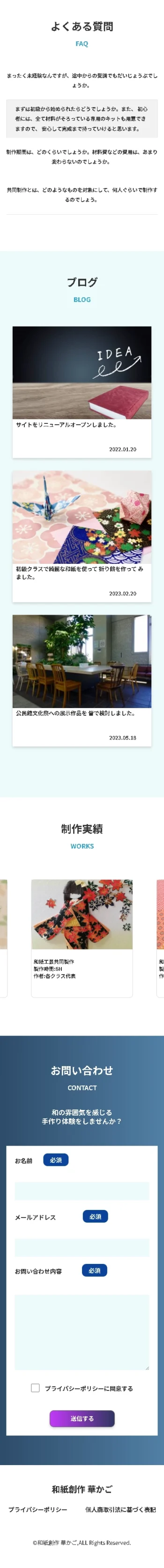 PORTFOLIO website 担当 Coding,WordPress 説明 架空のサイクリングクラブサイトです。トップページ含め4ページあります。ファーストビューはCSSアニメーションを使って画像切替を行い、少しズームをかけながらふわっと画像が切り替わるようにしています。ヘッダーはスクロールヘッダーで、宿泊予約ボタンを押すと予約モーダルが現れ、フラットピッカーを使い日時がカレンダーから選べるようになっています。さらに、お知らせセクションではjQueryを用いてタブでスムーズ時間を少しかけて表示内容を切り替えるようにしています。 デザインツール XD レスポンシブ 対応 制作時間 50時間 説明 BASIC認証をかけておりますので下記ユーザー名・パスワードでログインをお願いいたします。ユーザー名:k-kod.4530パスワード:kkkk-4530 サイトへ WORKS一覧へ