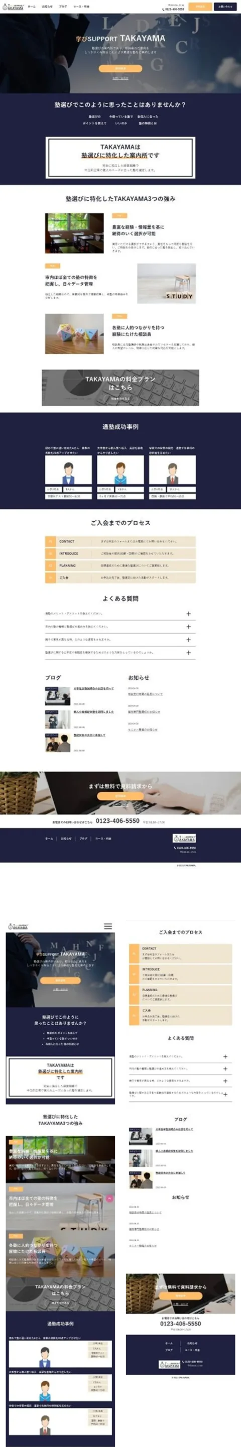 学習塾案内所TAKAYAMA2 website 担当 Coding,WordPress 説明 架空の学習塾サイトです。回答なしの教材をベースに、テーマを用いず、すべてオリジナルにて制作しました。トップページの成功事例部分と料金体系ページはカスタムフィールドでお客様からの変更要望に対応しやすくしており、 お知らせ部分はカスタム投稿タイプを使用しました。 また、記事ページでは関連記事やおすすめ記事を実装しており、カテゴリーでも呼び出せるようにしています。またSNSでも共有できるようにしています。この記事ページでは、 公式テストデーターを用いて動的処理による表示崩れ等のチェックを完了しています。またお問合せフォームでは自動返信メールの設定なども行っています。 デザインツール XD レスポンシブ 対応 制作時間 50時間 サイトへ WORKS一覧へ